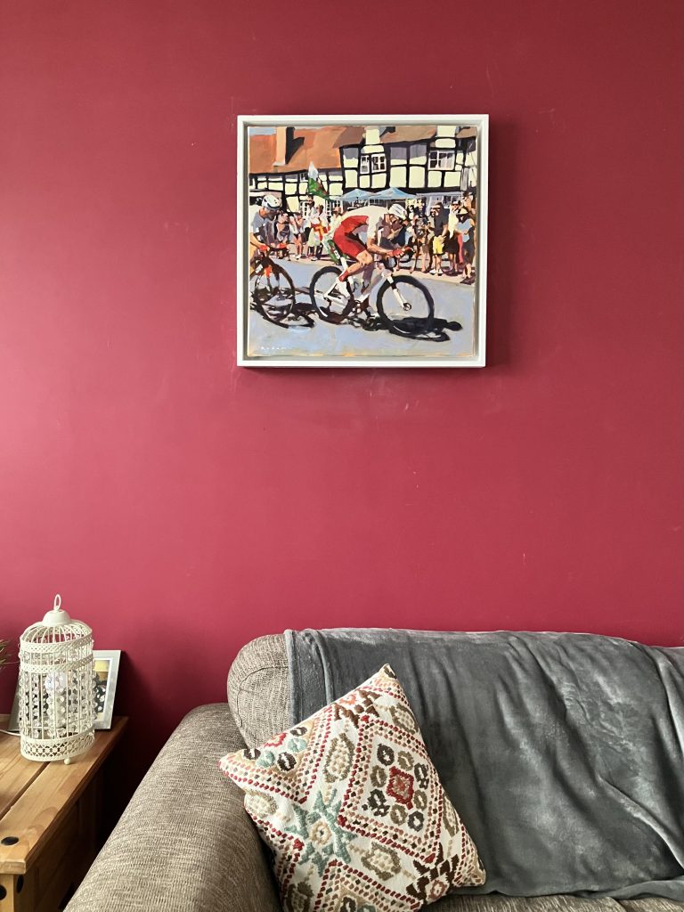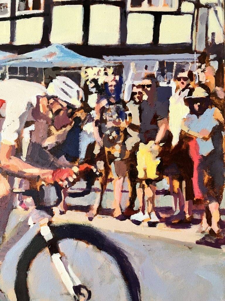 “The cyclist raced past my local pub, only round the corner from my studio. The colour of the flags in the sunlight and the smiles on the crowd were the main inspiration for this piece (as well as getting the pub, “The Black Pug” in the painting)!”